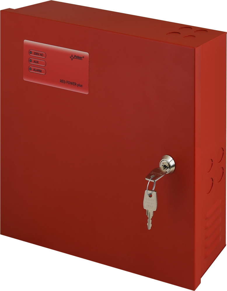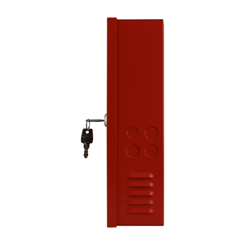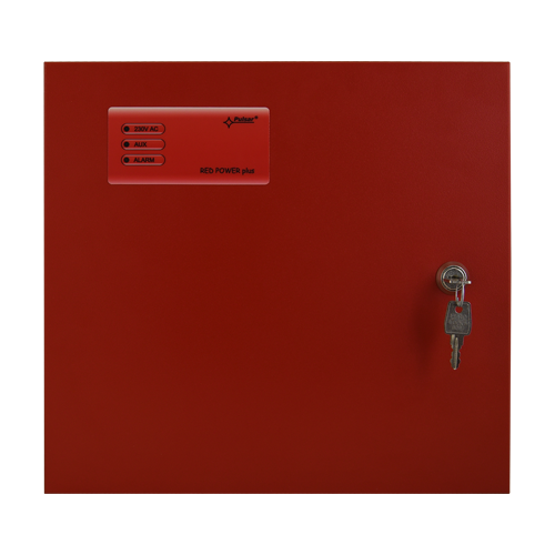 Sursa auxiliara pentru sistemele de incendiu, montare aparenta, incuietoare cu cheie, carcasa metalica rosie.