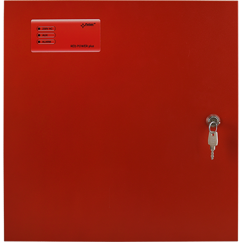 Sursa auxiliara pentru sistemele de incendiu, montare aparenta, incuietoare cu cheie, carcasa metalica rosie.
