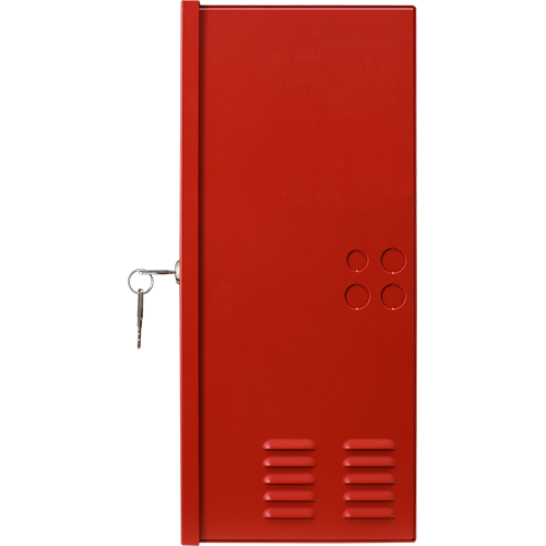 Sursa auxiliara pentru sistemele de incendiu, montare aparenta, incuietoare cu cheie, carcasa metalica rosie.