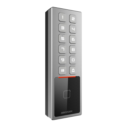 Terminal control acces cu functii de interfonie ce suporta diferite metode de autentificare (card, PIN). Carduri suportate M1. Distanta mica de citire a cardului de 0 ~ 4 cm. Buzzer incorporat.  Posibilitate de control cu ajutorul aplicatiei de mobil Hik-Connect.